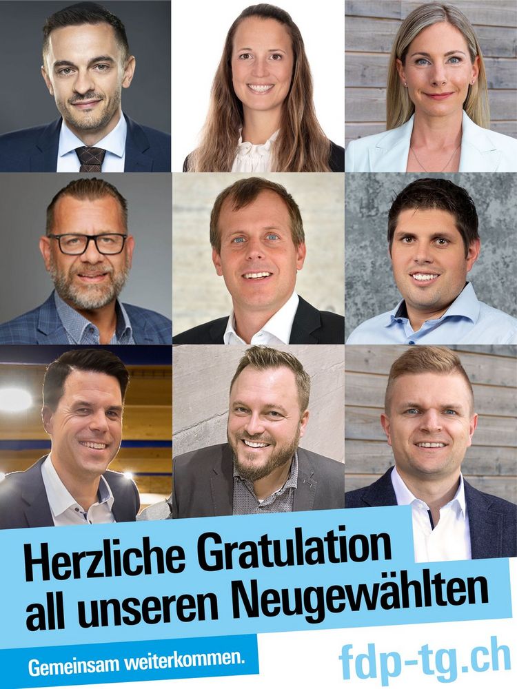 Wir feiern einen erfolgreichen Wahlsonntag: Pascal Styger neuer Berufsrichter im Bezirk Arbon, Patrik Forrer neuer Gemeindepräsident in Salmsach, Dominique Bornhauser neu in den Stadtrat von Weinfelden, Nicole Egli-Soller und Samuel Svec, beide neu in den Amriswiler Stadtrat. Unsere jüngste Ortspartei in Roggwil-Freidorf stellt mit Jürg Lengweiler erstmals einen Gemeinderat, in Egnach und Hefenhofen schaffen mit Andrea Roth, Reto Sproll und Philipp Schenk weitere FDP-Persönlichkeiten den Sprung in die kommunale Exekutive. Glanzvolle Wiederwahlen unserer Stadt- und Gemeindepräsidien wie auch kommunalen Exekutivmitglieder.