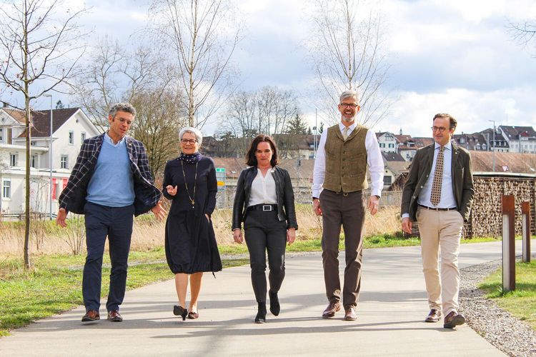 Bild: Auf dem Weg zur Bildungszukunft: Daniel Eugster, Brigitte Kaufmann, Kristiane Vietze, Anders Stokholm und David H. Bon. Die FDP Thurgau stellte im Murg-Auen-Park mögliche Thurgauer Leuchttürme im Bildungs- und Innovationsbereich vor.